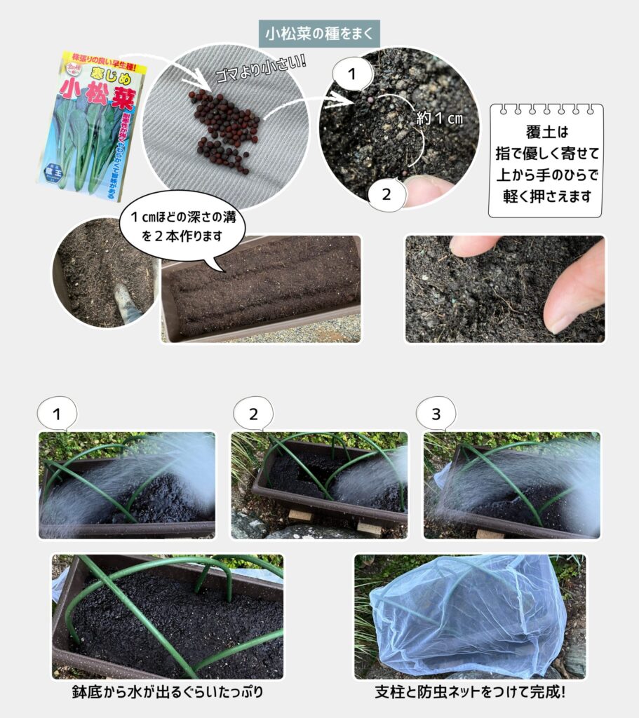 特に小松菜のような柔らかい葉物野菜は食害を受けやすいので、ネットの設置は欠かせない工程です。