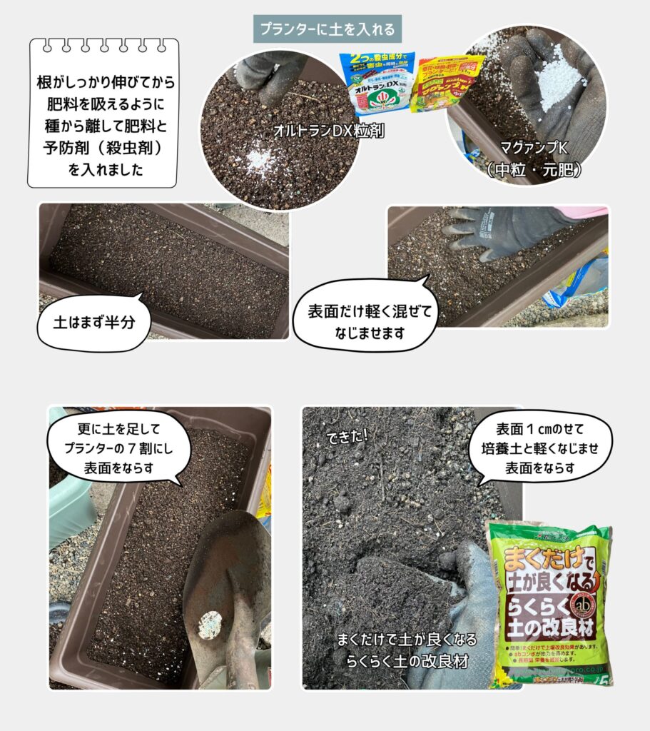 トマトを育てていた土でもあるので、堆肥と土壌改良資材をプラスし、肥料や害虫予防剤を加えて再利用します。