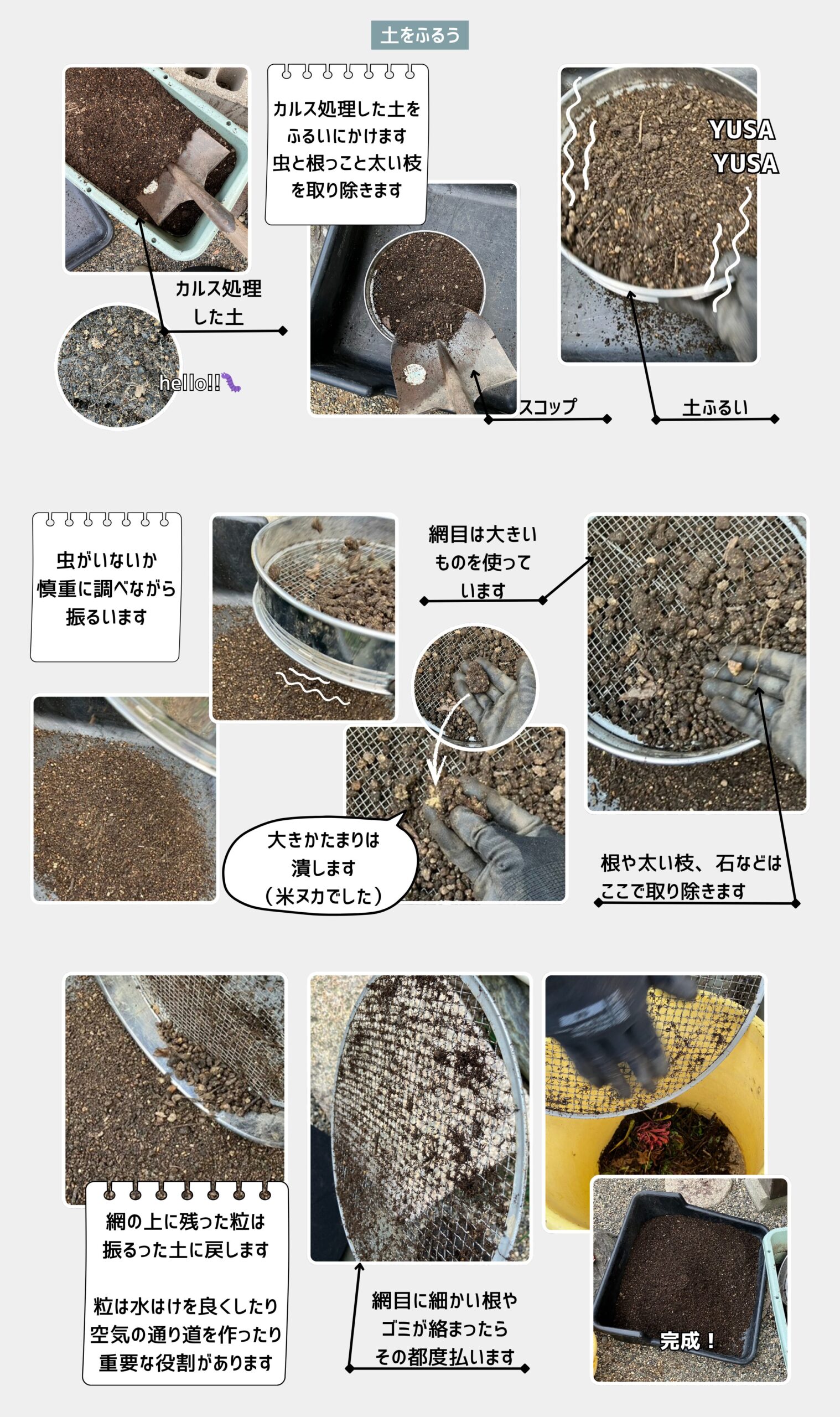 4. 大きな塊は捨てずに、振るった後の土に戻して再利用