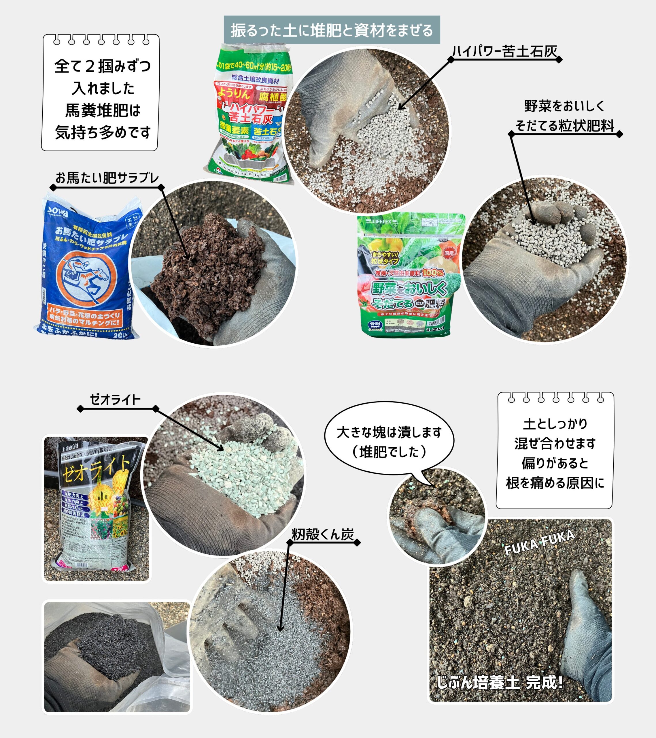 トマトを育てていた土でもあるので、堆肥と土壌改良資材をプラスし、肥料や害虫予防剤を加えて再利用します。