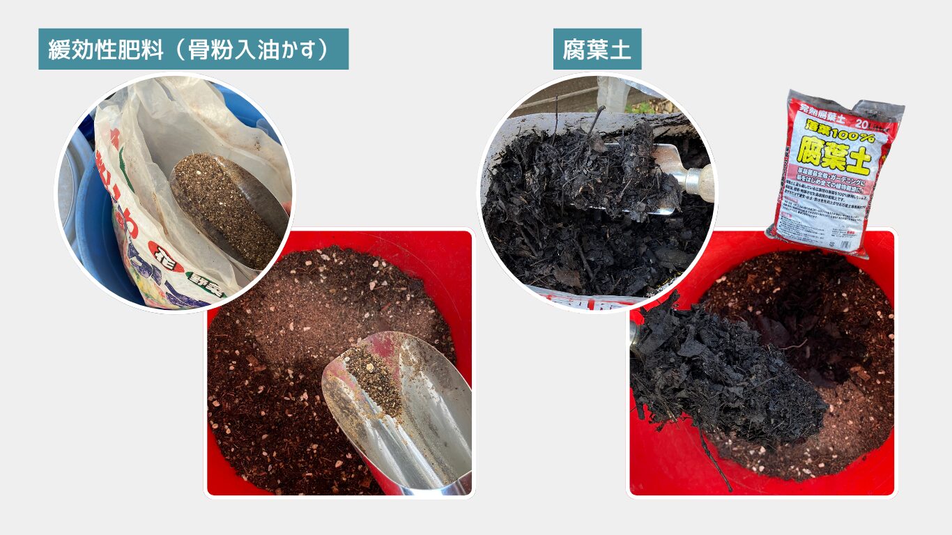 市販の培養土に、緩効性肥料(ゆっくり効くタイプの肥料)と腐葉土を少し混ぜると、根の伸びが良くなります。