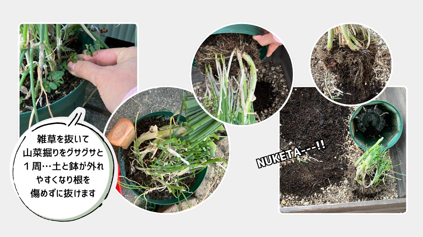 鉢の内側に細めのスコップ(山菜掘りなど)を差し込み、そっと持ち上げると根をあまり傷つけずに抜けます。