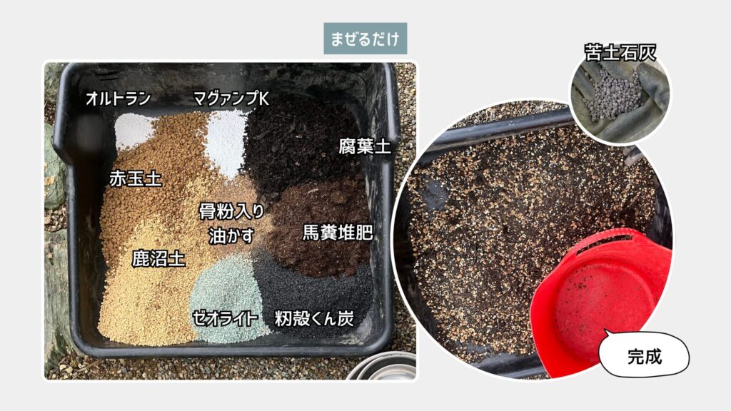 作り方はとても簡単です。すべての材料を広い容器やブルーシートの上でよく混ぜるだけ。ただし、混ぜた直後の土は微生物がまだ活発に働いていないため、1週間ほどフタをして休ませるのがポイントです。この“寝かせる時間”が、土の中の微生物を目覚めさせ、根が張りやすい環境を整えてくれます(サカタのタネ「どんな庭でも基本は土作りから」)。