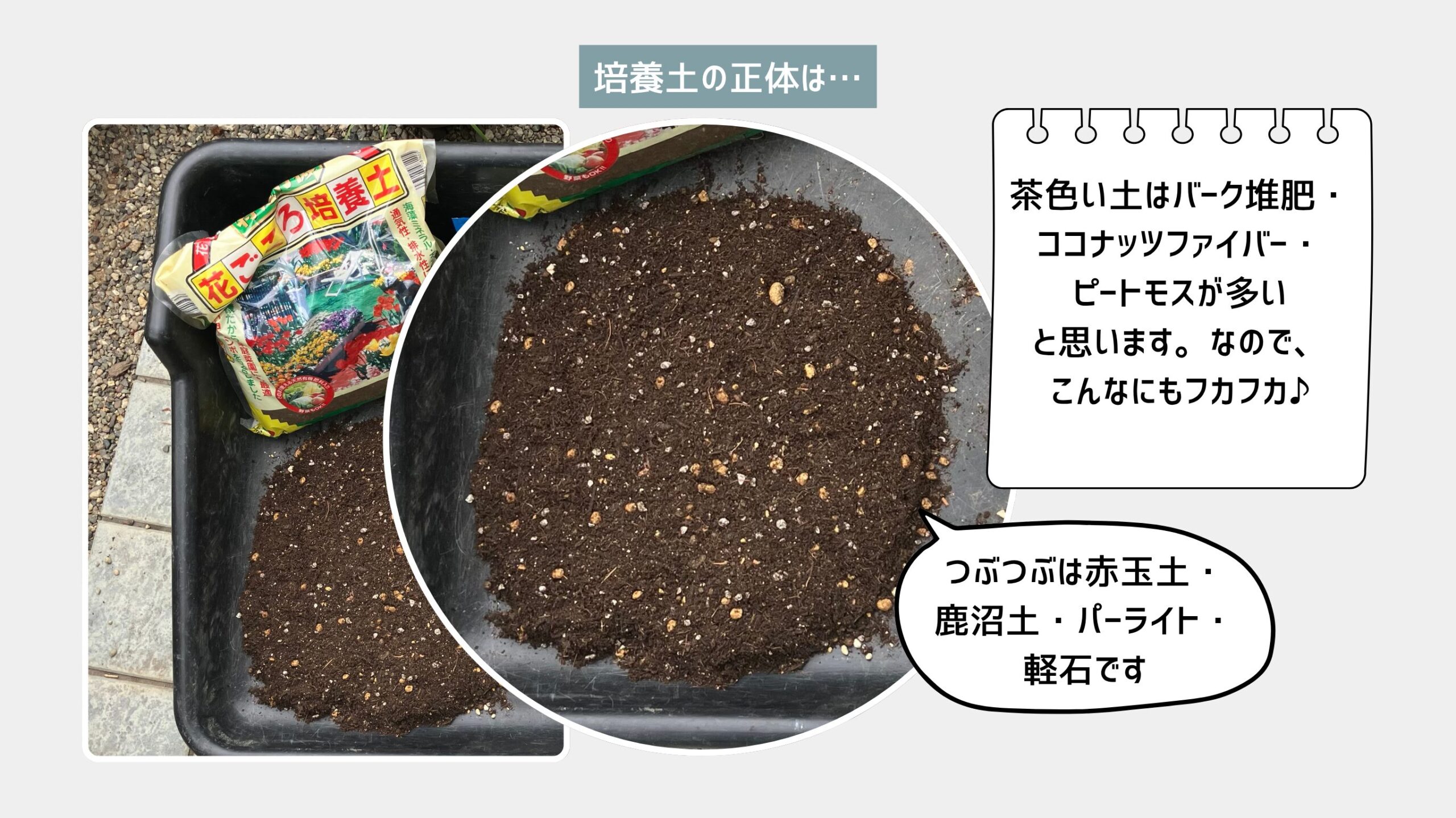 培養土とは、植物の生育に必要な環境を人工的に整えた“完成された土”のことです。市販の培養土には、あらかじめ緩効性肥料(時間をかけて少しずつ栄養を放出するタイプ)が配合されており、植えた直後から穏やかに生育を支えてくれます。