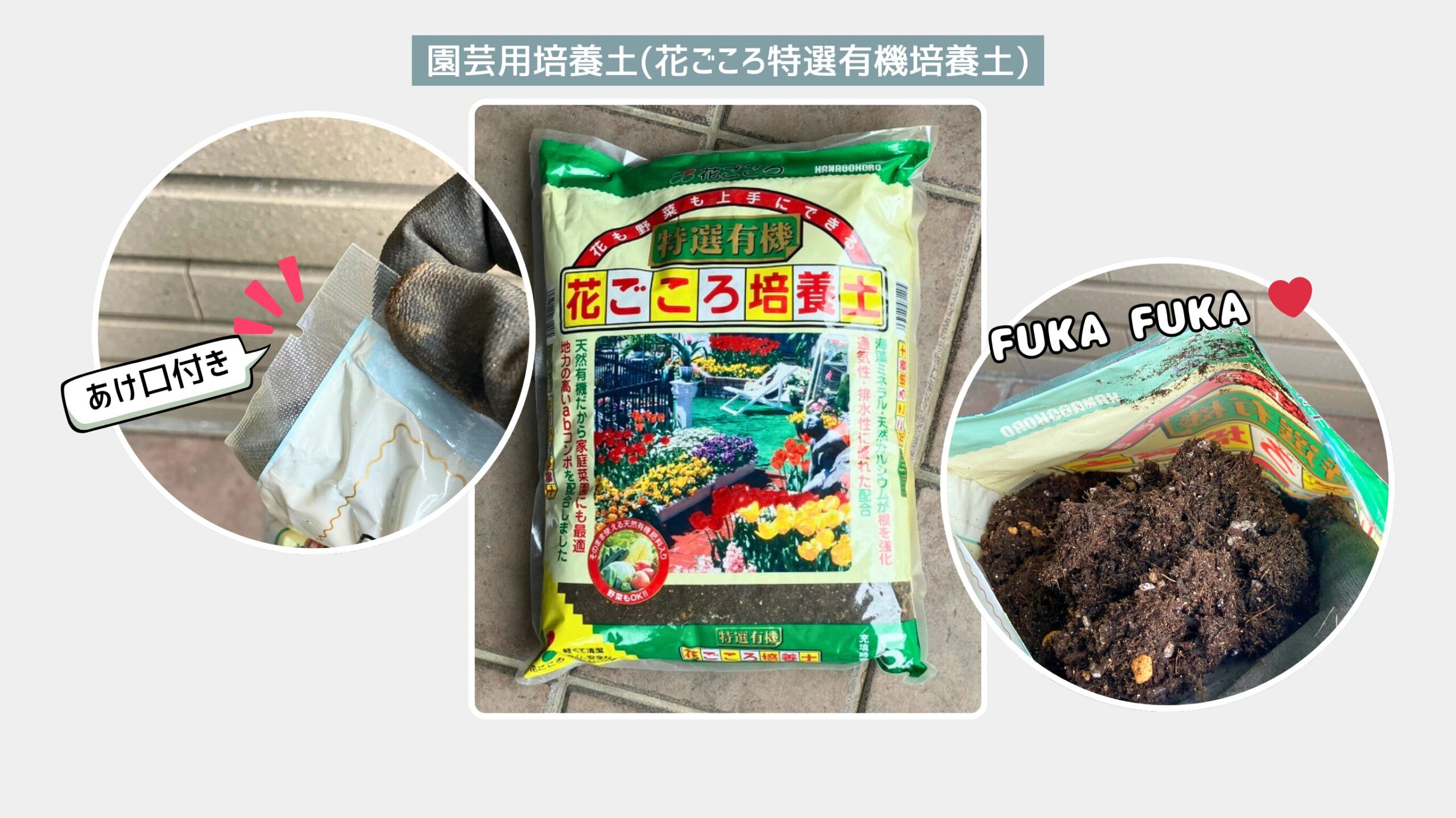 今回購入した「花ごころ 特選有機培養土」では、土の地力を高める「abコンポ」(有機成分を多く含む肥料)と、ゆっくり効く「緩効性化成肥料(IB肥料)」が使われています。