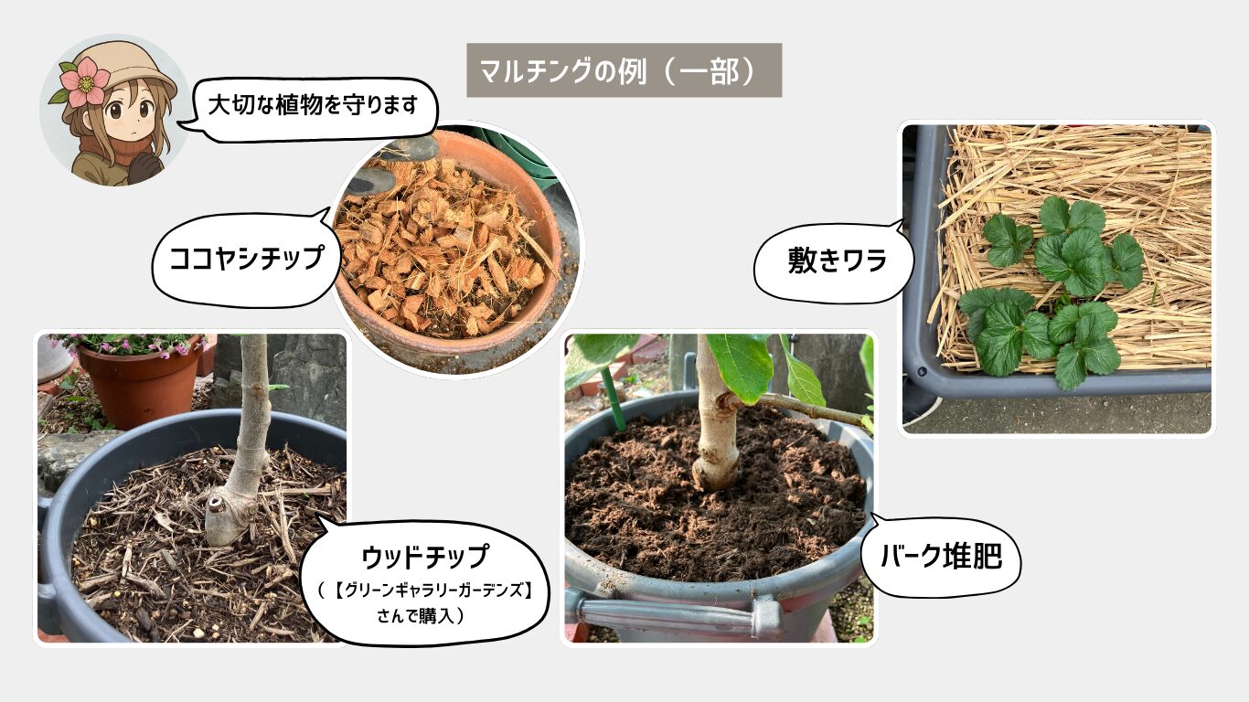 冬の寒さ対策として効果的なのが「マルチング」です。土の表面を覆うことで、