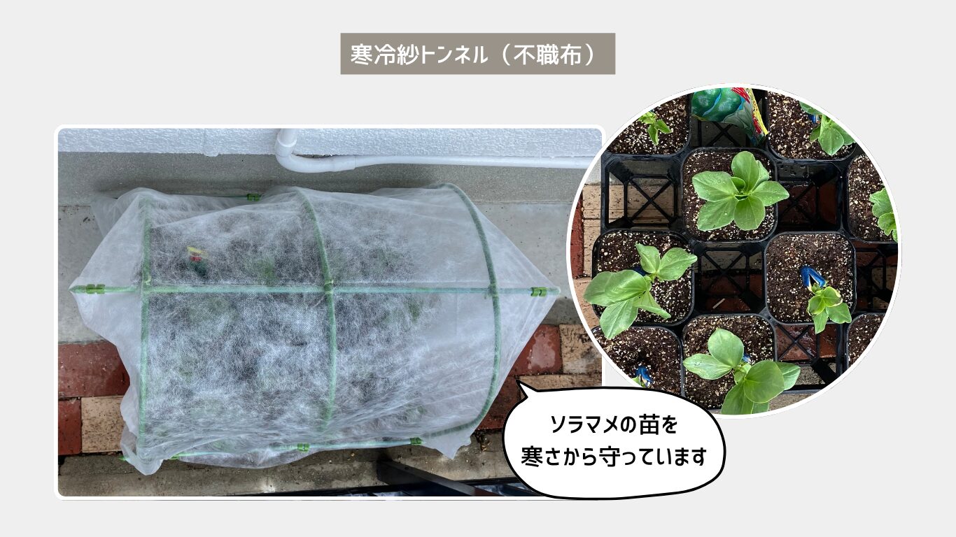 小さな苗やプランター栽培では、冷え込みの影響が大きいため、簡易トンネルを作るのも効果的です。