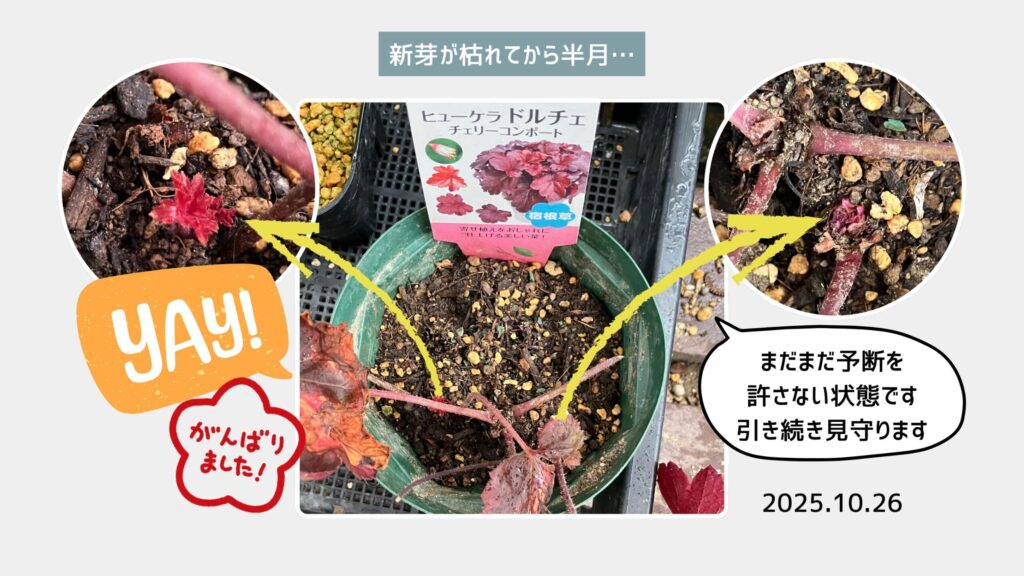 そして今朝、ついに変化がありました。ヒューケラ・ドルチェ「チェリーコンポート」特有の鮮やかな赤い新芽が2つ、株元に顔を出していたのです。思わず「やったー!」と声が出て、ひとりでガッツポーズ。小さな芽ですが、この2ヶ月の努力が報われた気がしました。