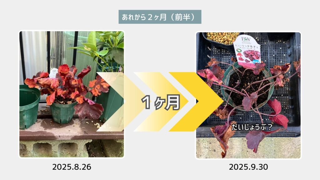 あれから約2ヶ月。当初は「1〜2週間ほど明るい日陰で養生させよう」と思っていたのですが、気づけば2ヶ月が経ちました。とはいえ、ヒューケラはもともと日陰を好む植物。10月中旬まで続いた強い日差しの中でも、思いのほか枯れてしまわずに過ごせていました。