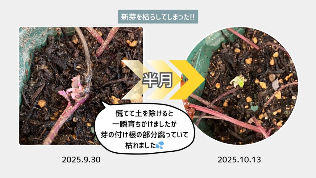 実は、植え替えの際に少し深く植えすぎてしまい、新芽が土に埋もれて枯れてしまいました。そこで、同じ失敗を繰り返さないようにと上の土を少し減らし、新芽がしっかり呼吸できるように調整しました。見た目は少し不格好でも、芽が顔を出せるようになったことで、再生のきっかけになったように思います。