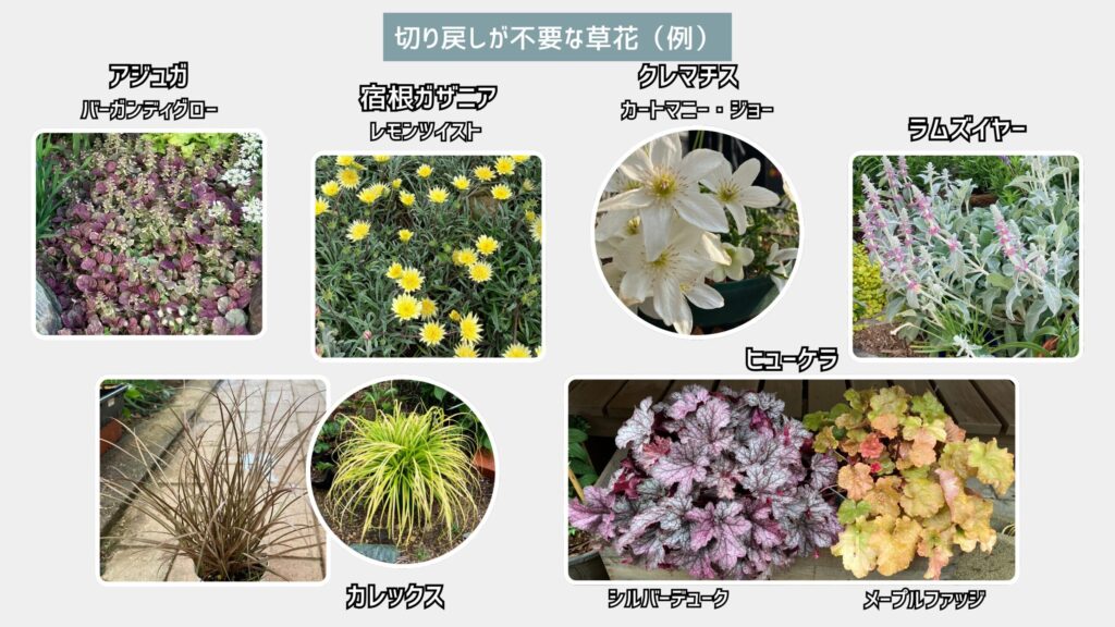 宿根草・多年草には、切り戻しをしなくても冬越しできるタイプと、切り戻しが必要なタイプがあります。見極めのポイントは「耐寒性」と「地上部の状態」です。