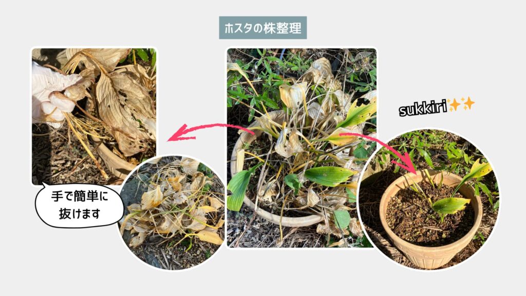 このような植物は、切り戻しよりも枯れ葉を取り除く病害虫予防と、マルチングや防寒対策をして冬に備えます。