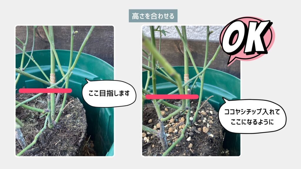 植え付け深さは、もとの鉢と同じ高さに合わせます。