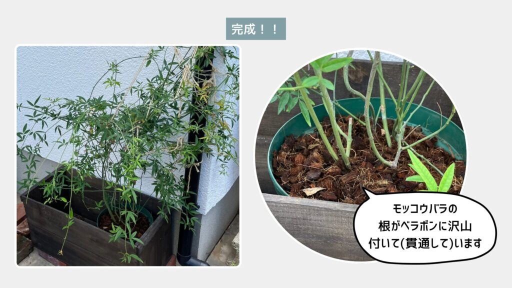 鉢ごとヤシガラチップ鉢に入れて育てていたモッコウバラを、スリットポットの8号ロング鉢に植え替えました。