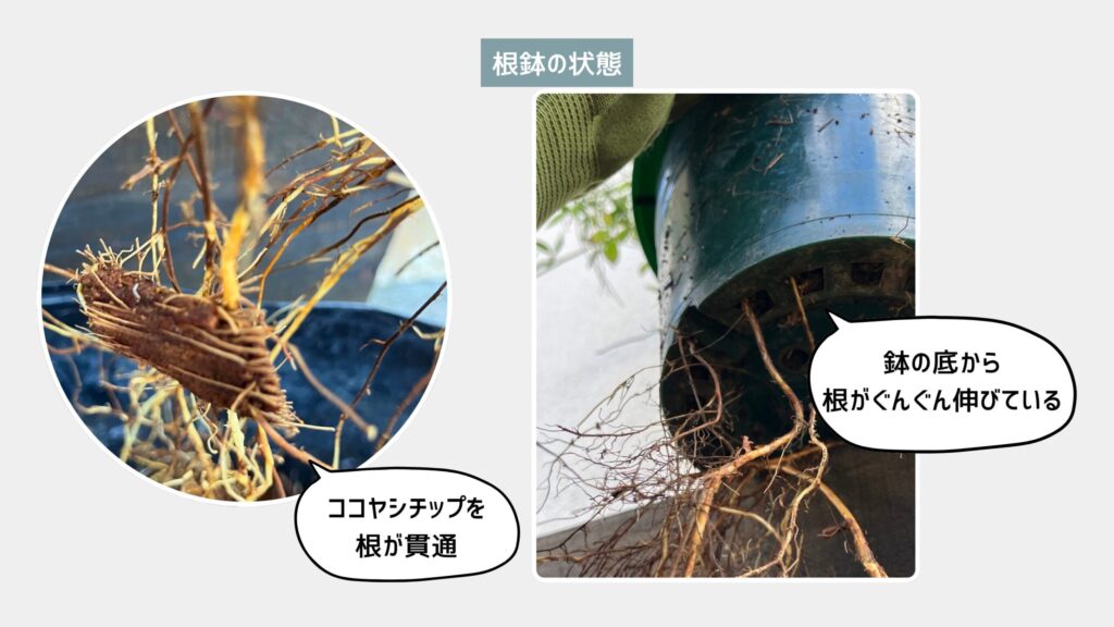 プラスチック鉢の底からは太い根が出ており、ヤシガラチップの間をしっかりと貫通していました。