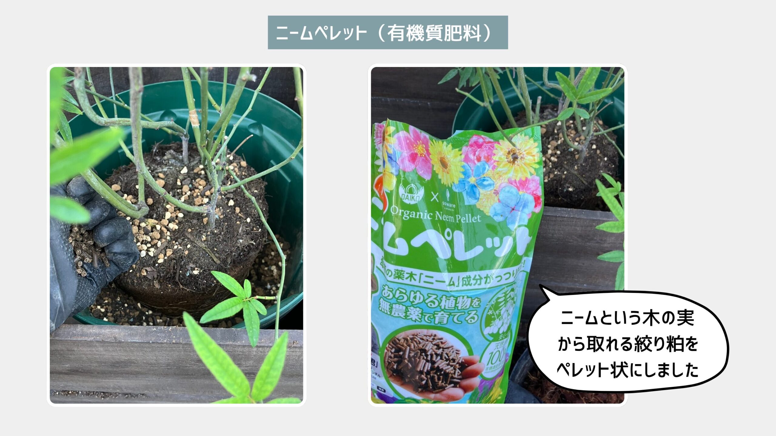 周囲に培養土を足しながら、今回初めて使うニームペレットを混ぜ込みました。