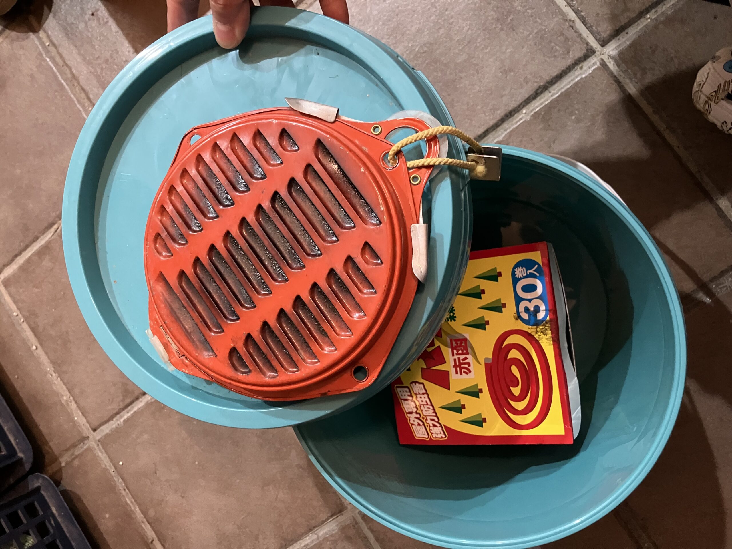 左から:パワー森林香専用携帯防虫器(箱・本体)、パワー森林香(上:箱、下:中身(2巻))