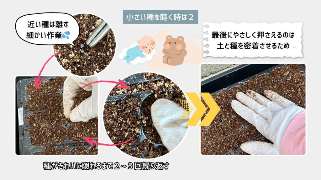 種同士がくっついてしまった場合は、蒔き終えてからピンセットなどでやさしく離します。