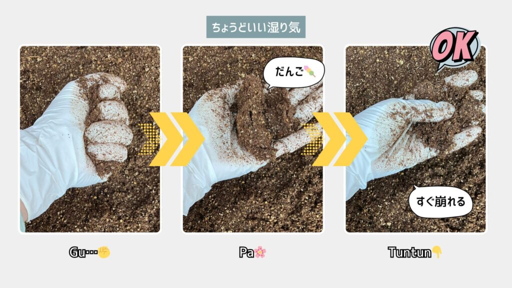 握ると軽く固まり、指でつつくと簡単にほぐれる程度がちょうど良い湿り気です。