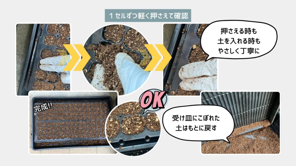 その後、1穴ずつ指で優しく押さえ、沈んだ穴には土を足し、再度優しく押さえて沈まないことを確認します。しっかり詰めすぎず、あくまで軽く整えるイメージです。
