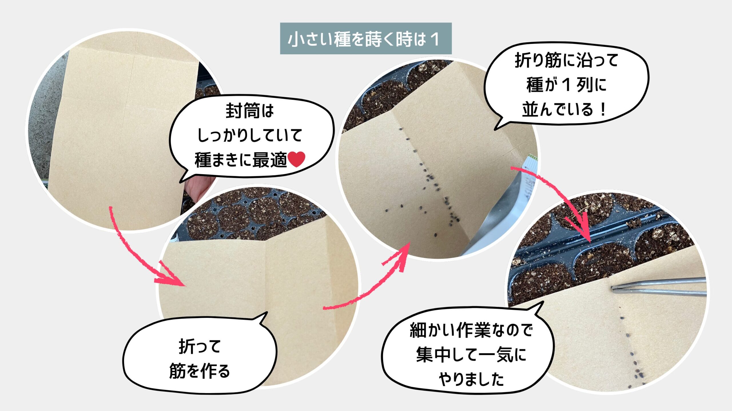 種同士がくっついてしまった場合は、蒔き終えてからピンセットなどでやさしく離します。