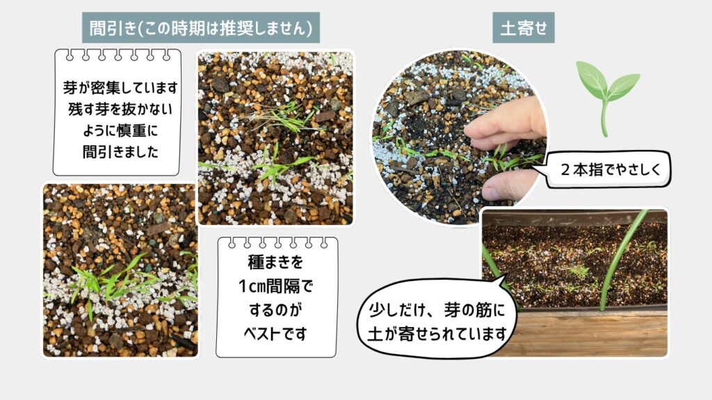 次回は、本葉が2枚になったら、1.5㎝間隔を目安に間引きと土寄せをします。最終的には本葉4〜5枚ごろに3〜5cmくらいの間隔に再び間引きします。