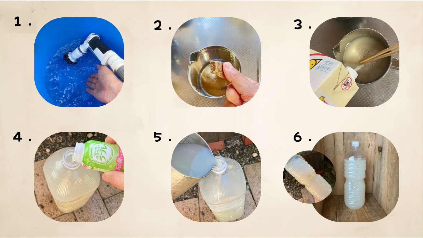 - 作る量は菜園規模に応じて調整(例:2Lで畝20mを散布可能)