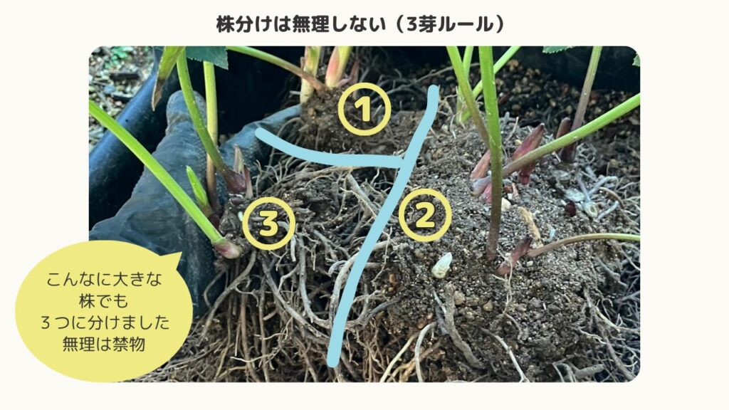 分けた1つの塊に、必ず芽が3〜5個付いている状態を保ちます。これより小さいと、体力が足りなくて枯れてしまう(活着不良)ので、注意が必要です。