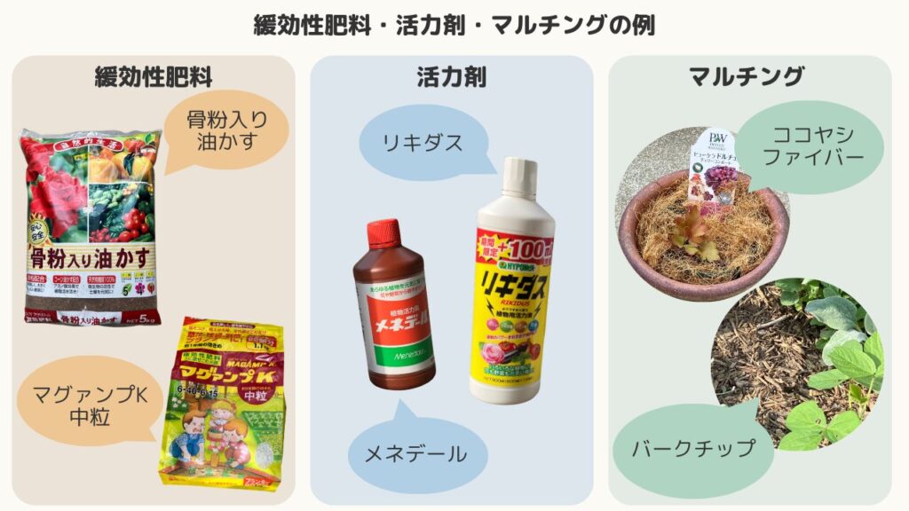 - 植える場所に腐葉土や堆肥を混ぜ、ゆっくり効く緩効性肥料(油かすなど)を加えます。