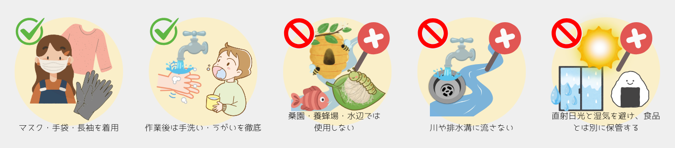 - 蚕(かいこ)・ミツバチ・魚類に毒性があるため、桑園・養蜂場・水辺では使用しない